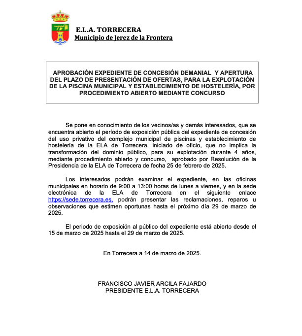 TORRECERA. 24 DE MARZO DE 2025. Se pone en conocimiento de los vecinos/as y demás interesados, que se encuentra abierto el período de exposición pública del expediente de concesión del uso privativo del complejo municipal de piscinas y establecimiento de hostelería de la ELA de Torrecera, iniciado de oficio, que no implica la transformación del dominio público, para su explotación durante 4 años, mediante procedimiento abierto y concurso, aprobado por Resolución de la Presidencia de la ELA de Torrecera de fecha 25 de febrero de 2025. Los interesados podrán examinar el expediente, en las oficinas municipales en horario de 9:00 a 13:00 horas de lunes a viernes, y en la sede electrónica de la ELA de Torrecera en el siguiente enlace https://sede.torrecera.es, podrán presentar las reclamaciones, reparos u observaciones que estimen oportunas hasta el próximo día 29 de marzo de 2025.